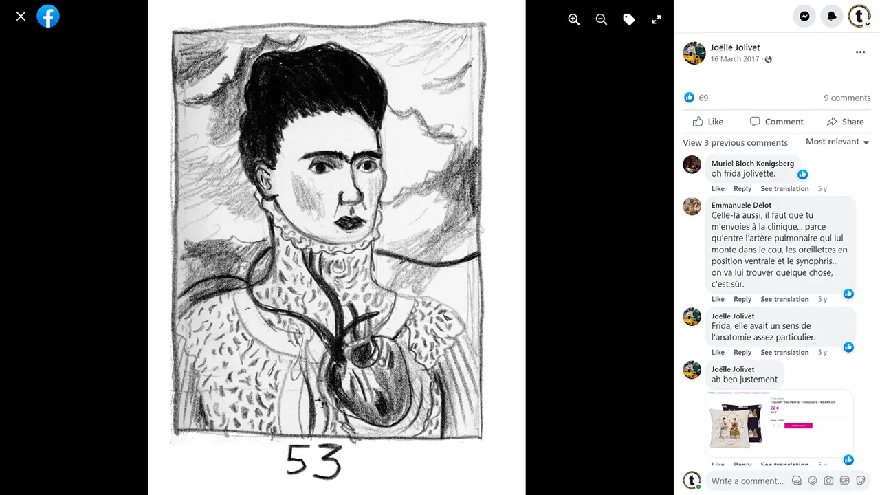 Every single day, she would post a drawing of herself in her incapacitated state. There was no self-pity in these portraits—they were honest in their depiction of pain, yet incredibly clever, full of wit and whimsy. We were amazed, and began to follow her progress through these drawings. It dawned on us that we were witness to the resilience of a remarkably creative human spirit, drawing on the expressive and healing power of art—day by day, in real time. It was quite an experience, and we were reminded of other artists, like Frida Kahlo, who had turned their suffering into creativity that resonated universally.