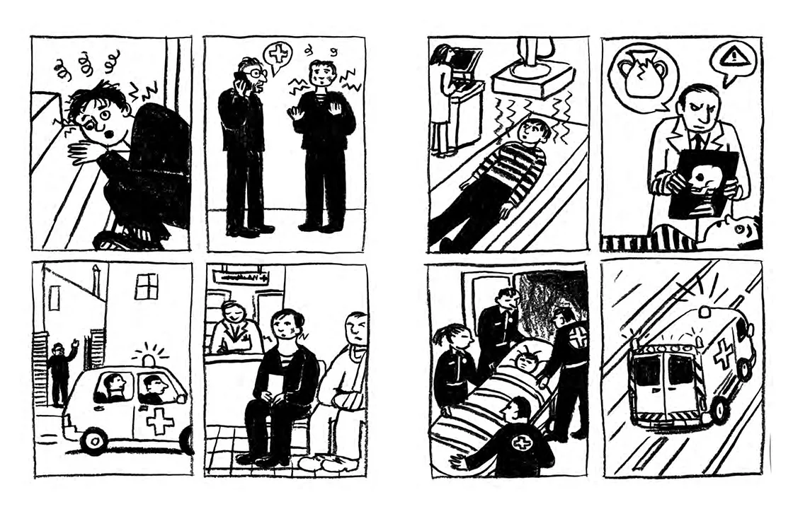 The second editorial input—if the book was to work as a book—was to have a prequel to the visual diary, which would set the situation in a context. Joëlle loves the comic book form, so we agreed on an introductory strip which would show the reader how she landed up in a cast in the first place.