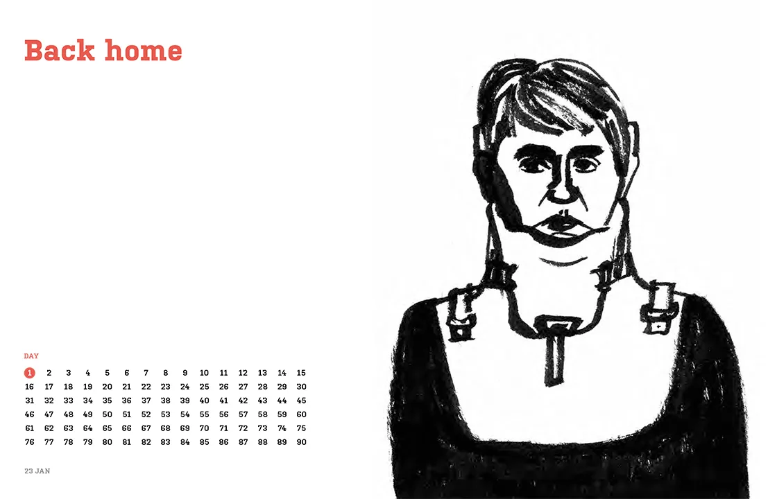 After some thought, we settled on a straightforward design that treated the flow of images as a calendar keeping track of a personal journey, taking the reader through the ninety days that Joëlle found herself trapped in a cast. The cover of the book was to be screen-printed, on red handmade paper, to resonate with the feel of a diary.