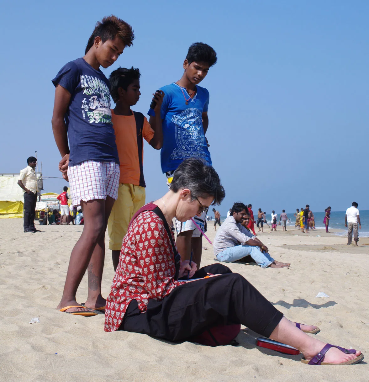 But to begin at the beginning: we had known the wonderful French illustrator Joëlle Jolivet for several years, and finally had the chance to work with her in 2014. Joëlle came to visit us in Chennai that year, and we spent happy times together at our local beach, as she worked on an unusual children’s book called An Indian Beach.