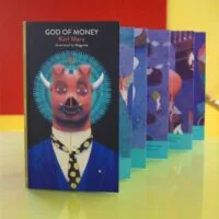 Maguma was enthused by the text, and came up with a startling visual interpretation that captured the deathly nature of profit-making and its smirking, self-satisfied character. He also designed the book as a series of accordion fold-out pages that simulated the endless and spiralling nature of avarice. Find out more about how God of Money was constructed, in our earlier blog post.
