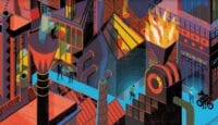 For this second part I had envisaged a dark urban atmosphere. I referenced the work of John Hejduk, Vladimir Tatlin and M. C. Escher to create the surreal forms I wanted. When they were complete, my drawings were in Egyptian perspective, and clothed in colours that were very different from those that featured in the first half of the narrative. The landscape of the story had turned electric and obsessive, reminding one of an oppressive video game that Hans wants to exit, at any cost.