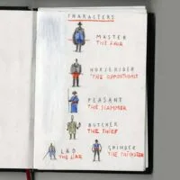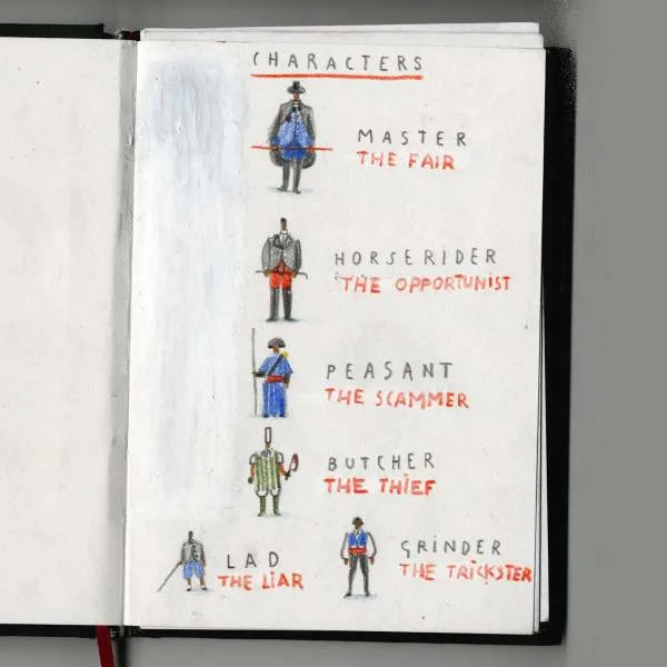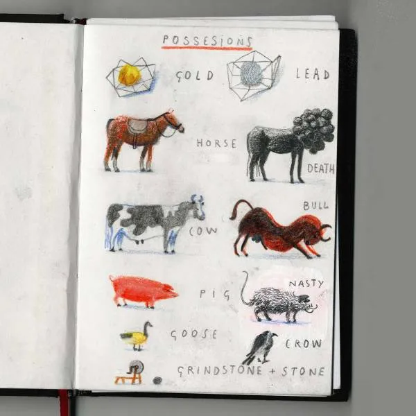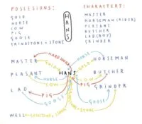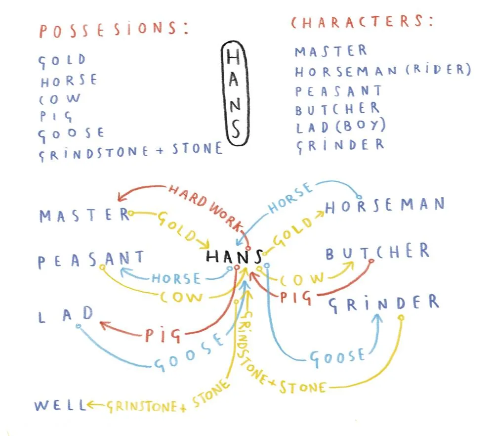 After I had reviewed various versions of the story, I began drawing. I started with all the characters that Hans meets. I also ended up drawing their possessions, the objects that they trade for whatever Hans has.
