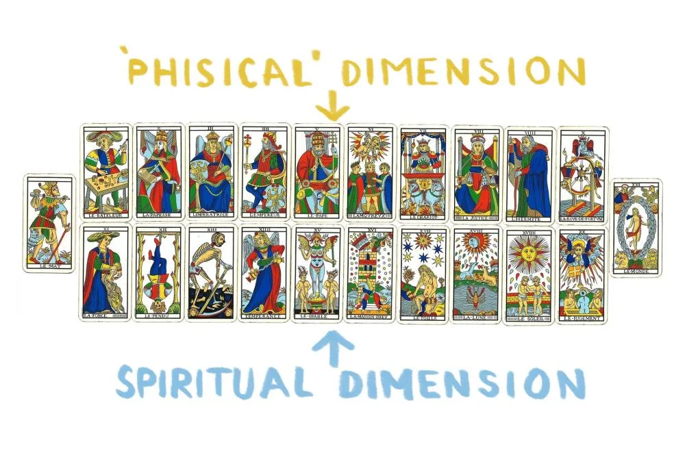 To explain the general meaning of the major arcana, Jodorowsky arranged the 22 cards from the Marseilles tarot (which is one of the more widely known tarot decks), in two parallel rows of ten cards each. The rows represented the two dimensions of the initiatory journey of knowledge that a human being might yet undertake: the physical and the spiritual. There are two arcana that are outside these two dimensions: The Fool, which, unlike the other cards, does not have a number and The World, which is marked with the number XXI.
