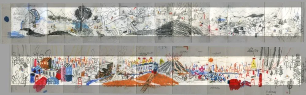 When I was done, I had before me a long continuous scene, rich in texture, with an abundance of gray tones punctuated with splashes of intense colour – which ends at a blue door, presumably the entrance of Hans’ home. But of course the story does not end here, and you flip the fold and find yourself in a second story.