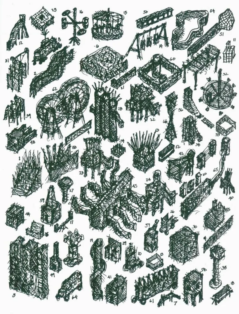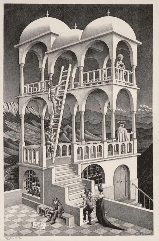 The works of John Hejduk, Vladimir Tatlin, and M.C. Escher (from left to right)