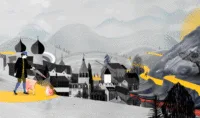 Trying to construct all of this visually, I was faced with the challenge of representing the two different but connected ways of thinking about Hans. Whether we see his journey as physical or spiritual, or both, it is the path that stands out. So I turned it into a visual motif, and made it the protagonist of the tale. Meanwhile, I had decided that I would tell this story from two times as well, the past and the present. This meant that the story had to move spatially, and across two different landscapes.