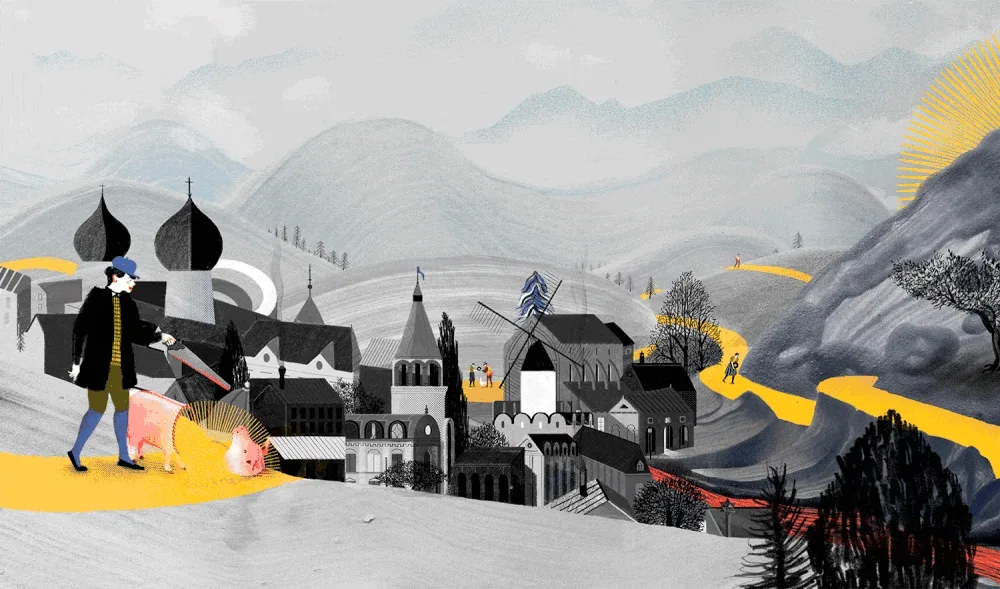The next step was to create appropriate landscapes through which Hans travels: I decided that I would evoke time past by setting the story in a natural landscape, with mountains and rivers, and which would retain the fairy-tale quality of the original tale. For the other version of the story, set in the present, I decided to create a dystopian urban reality with clear references to our contemporary world. In order to retain visual unity between both parts of the narrative, I sought to develop Hans graphically, so that he could credibly occupy both worlds.