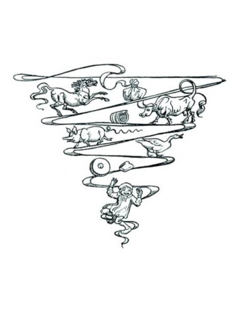 In these initial drawings, I viewed these objects of exchange, from two perspectives: not only Hans’, but also of the secondary characters who trade things with him. To me there seemed to be two aspects to the exchange process, one positive and the other negative. In some cases the object that was acquired from Hans resulted in good fortune for the secondary character in question, whereas in some other cases, it led to misfortune. I also drew the moments of exchange, like other illustrators had done.