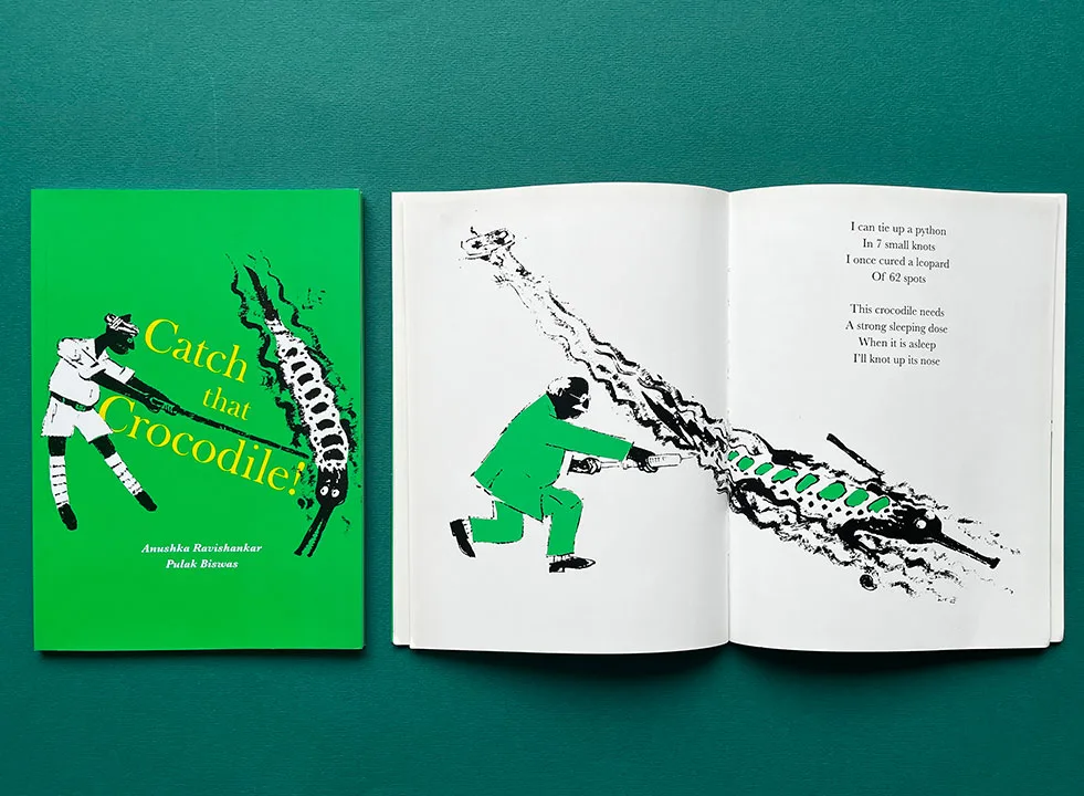 I followed this one up with another — Catch that Crocodile. Again, based on a partly true story about a crocodile that was found in a small town’s water lines. This time, I wrote the story first, in detailed prose. After Pulak drew the pictures, I deleted the text and rewrote it in verse. There was a lot of nonsense in this text too — like this description of a doctor who tries to inject the animal to sleep:
