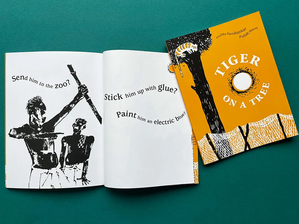 In 1996, I joined Tara as an editor. One of my earliest assignments was to write the text to a story which had been told pictorially by the much-beloved illustrator, Pulak Biswas. He had been inspired by a partly true story about a tiger that strayed into a village. I looked at the illustrations and my first reaction was that it really did not need words. The illustrations already told the whole story. So what was I to do? I began to write, trying to keep the text at a tangent to the pictures. While the whole poem wasn’t nonsensical, I wrote some very absurd lines — for example, these ones, which have the villagers pondering over what to do with the beast: