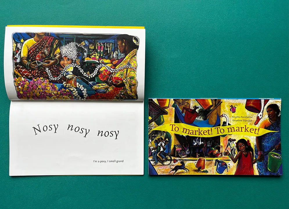 For instance, In To Market! To Market!, Emmanuele Scanziani had done a set of pictures of a market in Pondicherry, in vivid detail and deep, dramatic colours. It became the story of a girl going through a market and having so much fun that she forgets to buy anything. But before the story came the words, bounding, buoyant… and suggested by the pictures. And the story followed that joy. The verse was a reaction to the market itself (or not the market, if we’re being Magritte-ish).