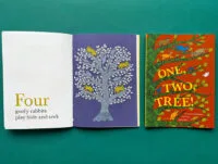 This was the case with One, Two, Tree!: Gita Wolf was taken with Pardhan Gond artist Durgabai’s beautiful trees, each of which was a world unto itself. Wanting to work with her, she came up with the idea that perhaps we could have several animals getting on to a tree that expands to accommodate them all, and have Durga illustrate it. I rendered the tale in verse, and Rathna Ramanathan designed the book, bringing in spot colours, and using the page as a sort of canvas for the text.