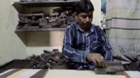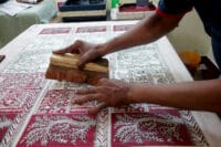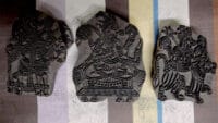 (L) Artist Jagdish Chitara block-printing, (R) A collection of his wooden blocks