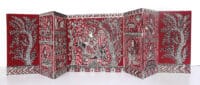 On the main panel of this textile book, is the Mother Goddess, the central figure in the original art form, and she is placed within a grid evoking the architecture of temple doors and alcoves. She is surrounded by attendant gods and goddesses, along with their animal companions, each of whom have their own myths and stories. As is the case in many Indian indigenous art traditions, everything is represented together and sequential events in the story appear to happen at the same time.