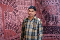 Despite their extraordinary skill and imagination, we discovered that most Vaghari artists continue to be impoverished, though some of them, like Jagdish, have begun to use their skills in other ways. He sells secular versions of Mata-Ni-Pachedi, as fabric art. Like other artists, he also creates work that would appeal to a middle-class clientele — from textile and paper paintings to decorative homeware — which allows him access to a small craft market and a modest additional income. In spite of all this, sadly, the social status of Vaghari artists has not changed very much. This has to do with the fact that in caste society, the low social status ascribed to the patrons of Mata-Ni-Pachedi also extends to the artists who create them, and by implication, to the art itself. Historically, in India, artisanal labour and the art forms associated with it are considered high or low depending on the status of the practitioners. The fact that artisans have gone on to create work that is new or beyond a traditional or caste function has not mattered very much.