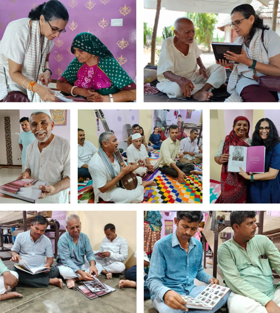 Soon after completing this project, I paused my practice as a book designer to begin a postgraduate course in design research in the United Kingdom. This meant that I would miss the most exciting part of book production and publishing – seeing it all come alive in print. I was envious of the Tara Books team as they shared with me photographs of the printing-in-progress. However, this disappointment was quickly replaced by gratification when the book made its way from the shelves at Tara Books, via Meera, to the weavers in Kutch. Here, it was celebrated with music and the coming together of the community. There could not have been a more fitting start to the book’s journey.