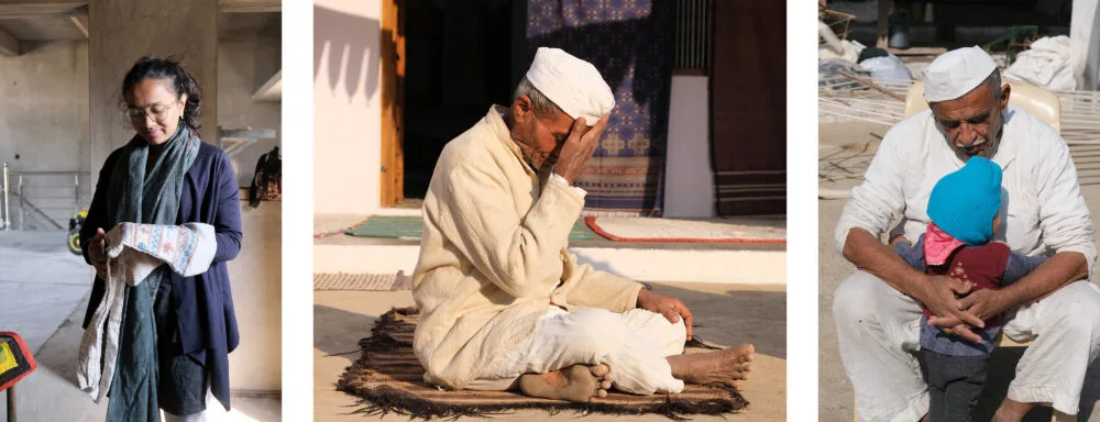 The complex organisation and planning for this visit and travel over long distances every day meant that the photo-taking had to be done as quickly and unobtrusively as possible. On most days, we were also frantically chasing the light, hurrying to reach our destination before the ‘good’ light and shadows vanished. In retrospect, the photographs became a by-product of the greetings, invitations to come in, curious enquiries about this book, and discussions on the craft and community over several cups of hot chai. I was a fly on the wall, and with my knowledge of Gujarati beginning and ending with kem chho? (how are you?), my communication with most people was through warm smiles and gestures.