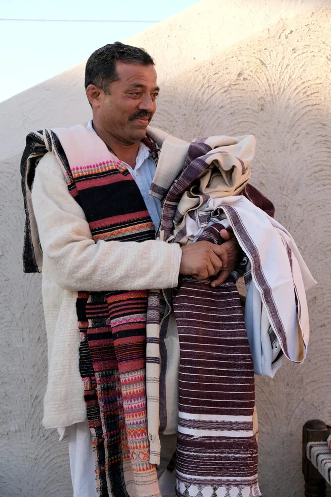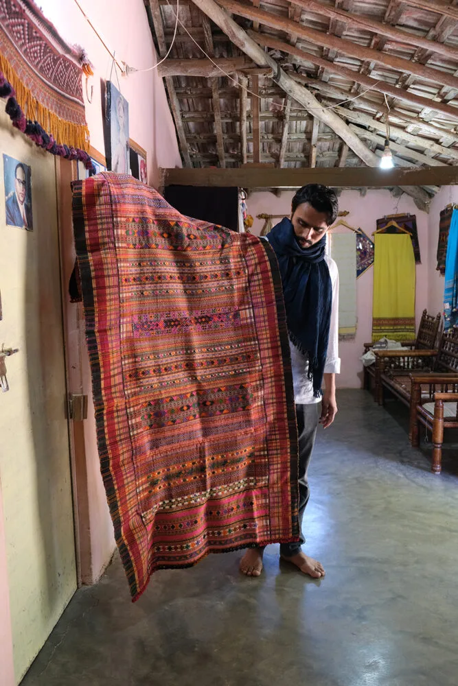 Shamjibhai Vishram Siju displays traditional shawls from his collection
