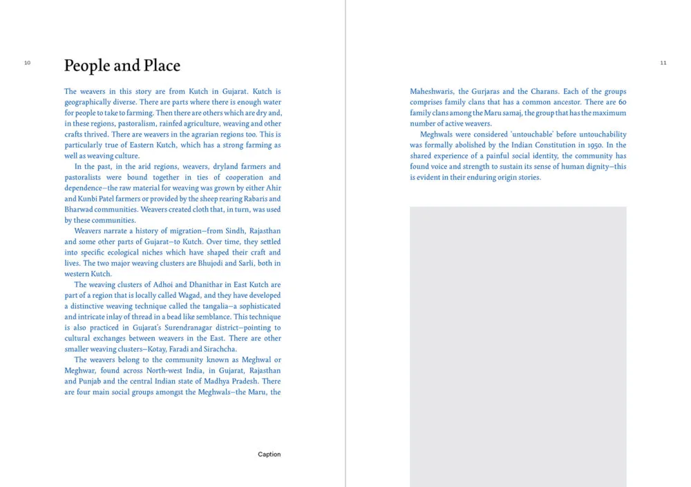At this point, we made the decision to introduce some image-only sections, which would serve as a bridge between two text sections. This was also a chance to feature people and processes that did not appear elsewhere in the text. Eventually each of these visual narratives featured photographs that would help readers recreate the many worlds of the weavers in their own imagination.