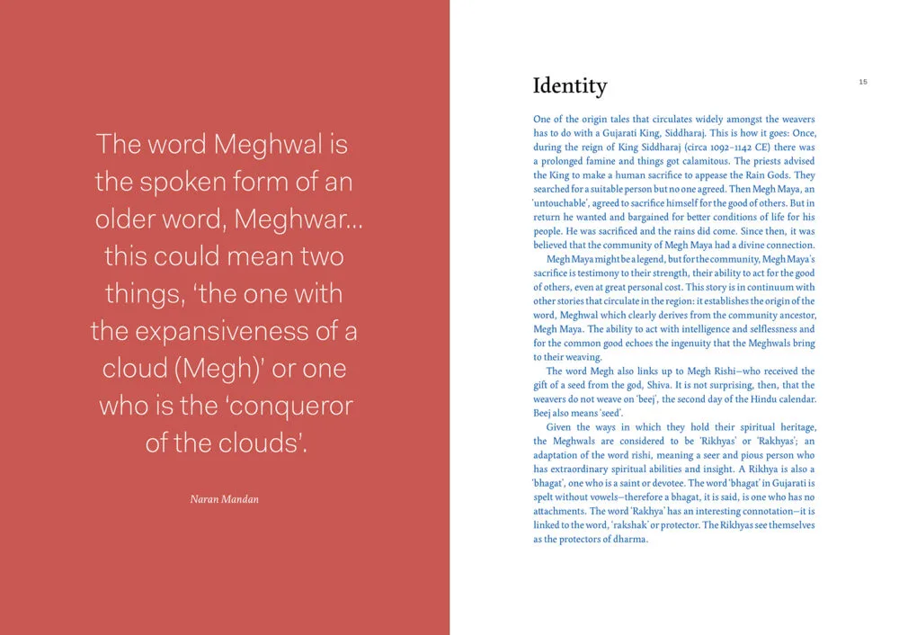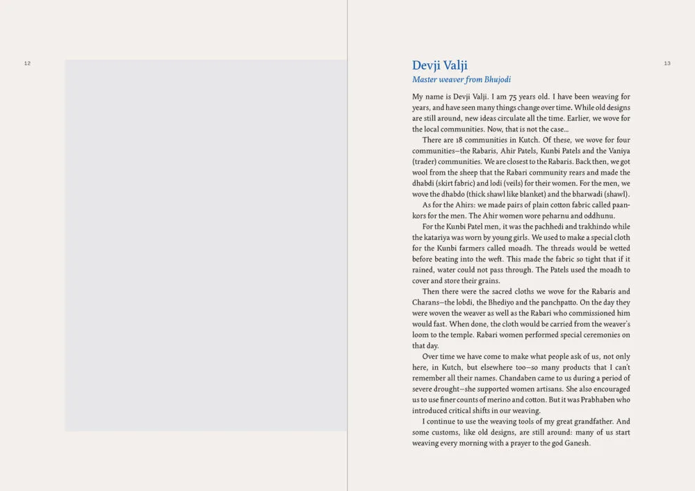 Pages featuring the weavers’ reflections were given an off-white background tint, while the text was typeset in black.