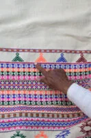 The second, called ‘Weaving Stories’, focuses on the craft of the weavers and includes a selection of weaves, from traditional designs to newer experiments. During our trip, we had requested each weaver to show us and talk about a piece of woven cloth that was personally valuable and meaningful. This memory that they associated with the fabric brought out the deep interconnection between their lives and their passion for the craft. This section is also a subtle reference to an earlier book by Tara Books called Signature, which featured a collection of decorative patterns, each unique to the artist, by an indigenous artist community from central India.