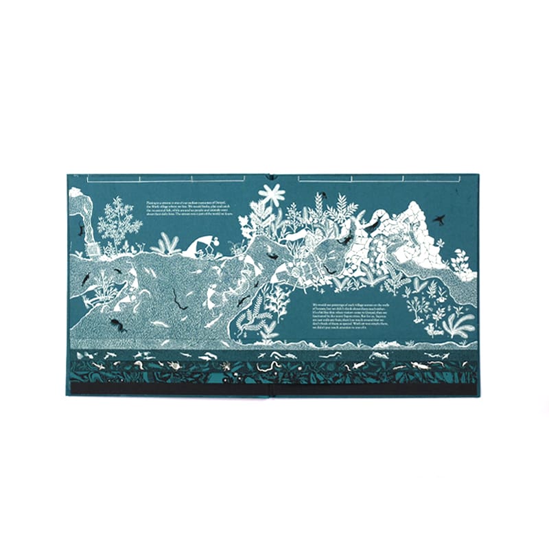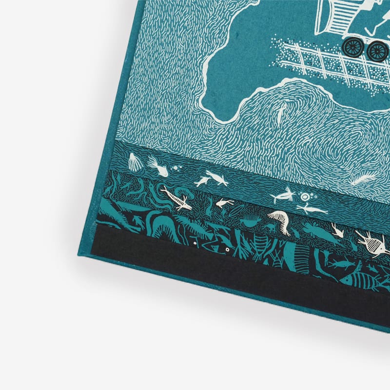 This hand-bound book has been silkscreen-printed by hand on recycled cotton paper. The marbling pattern on each cover is unique, and made by capturing colour on the surface of water at a moment in time.